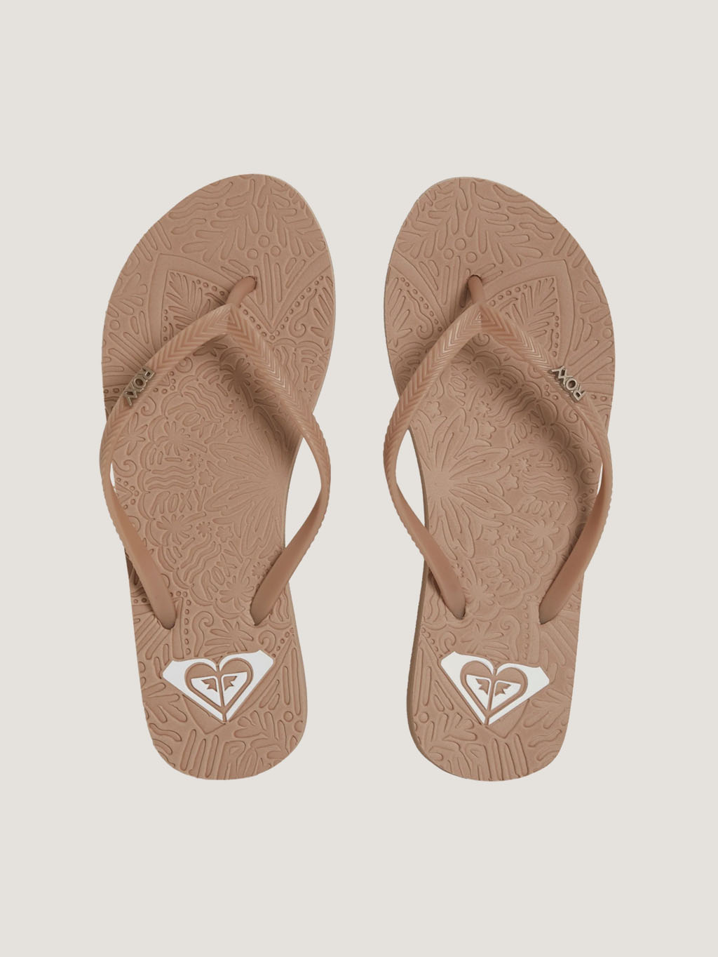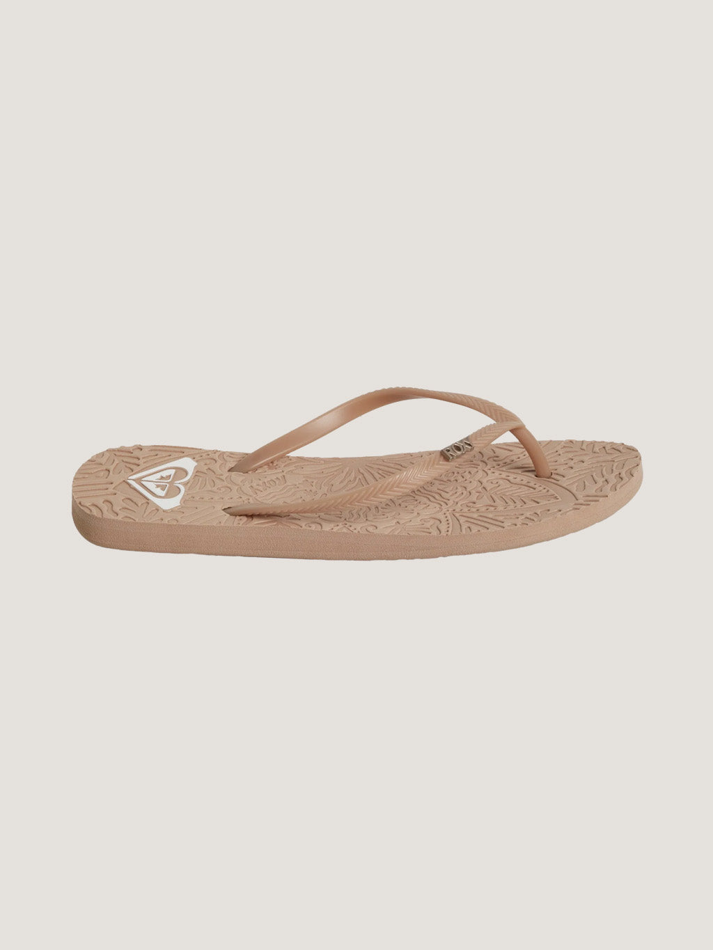 Tiras flexibles de TPR texturizado con pasador metálico ROXY. Plantilla de goma esponjosa y EVA suave con diseño floral en relieve.
